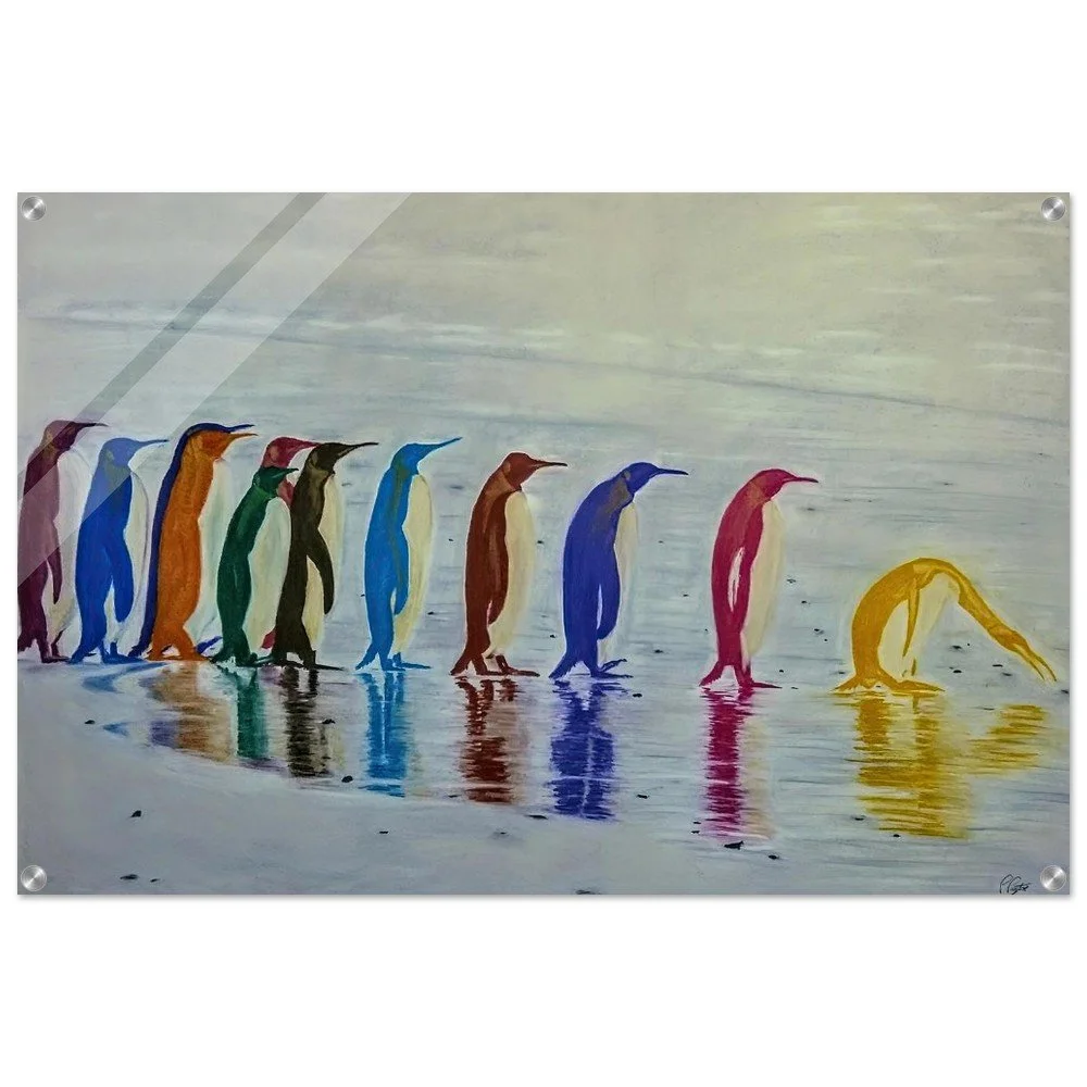 Bring a splash of whimsical color to your space with the "Perambulating Polychromatic Penguins" Acrylic Print. This stunning piece showcases vibrant, high-resolution imagery with a glossy, glass-like finish and incredible depth, making it a true statement for any room. Crafted from durable, scratch-resistant 4mm acrylic, it’s designed to last and impress. Perfect for adding a modern, artistic touch to your home decor, corporate office, or gallery. Featuring sleek straight-cut corners and easy-to-use hanging hardware included. Available in 18 sizes to fit your unique space. Printed and shipped on demand – no minimum orders required. Elevate your walls with this eye-catching, contemporary art piece today!